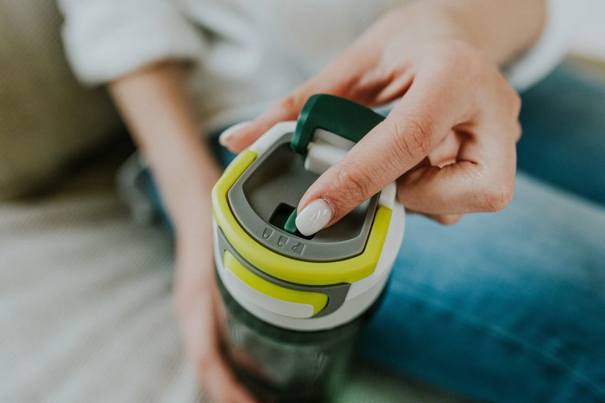 1: Druk’-positie: druk op de knop van onze drinkfles om een slok te nemen. Nooit meer morsen terwijl je haast naar de volgende meeting of al rennend je trein probeert te halen.