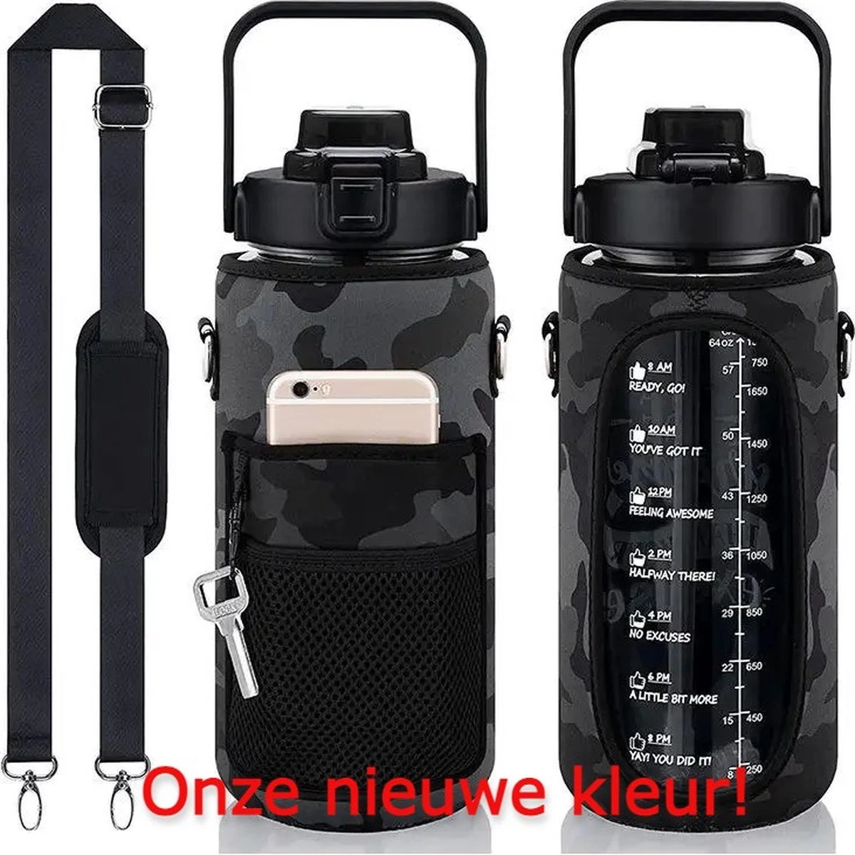 Onze 2 liter drinkfles met bijpassende sleeve en motivatie armband! Neem je drinken nu nog makkelijker overal mee naar toe samen met je allerbelangrijkste items.