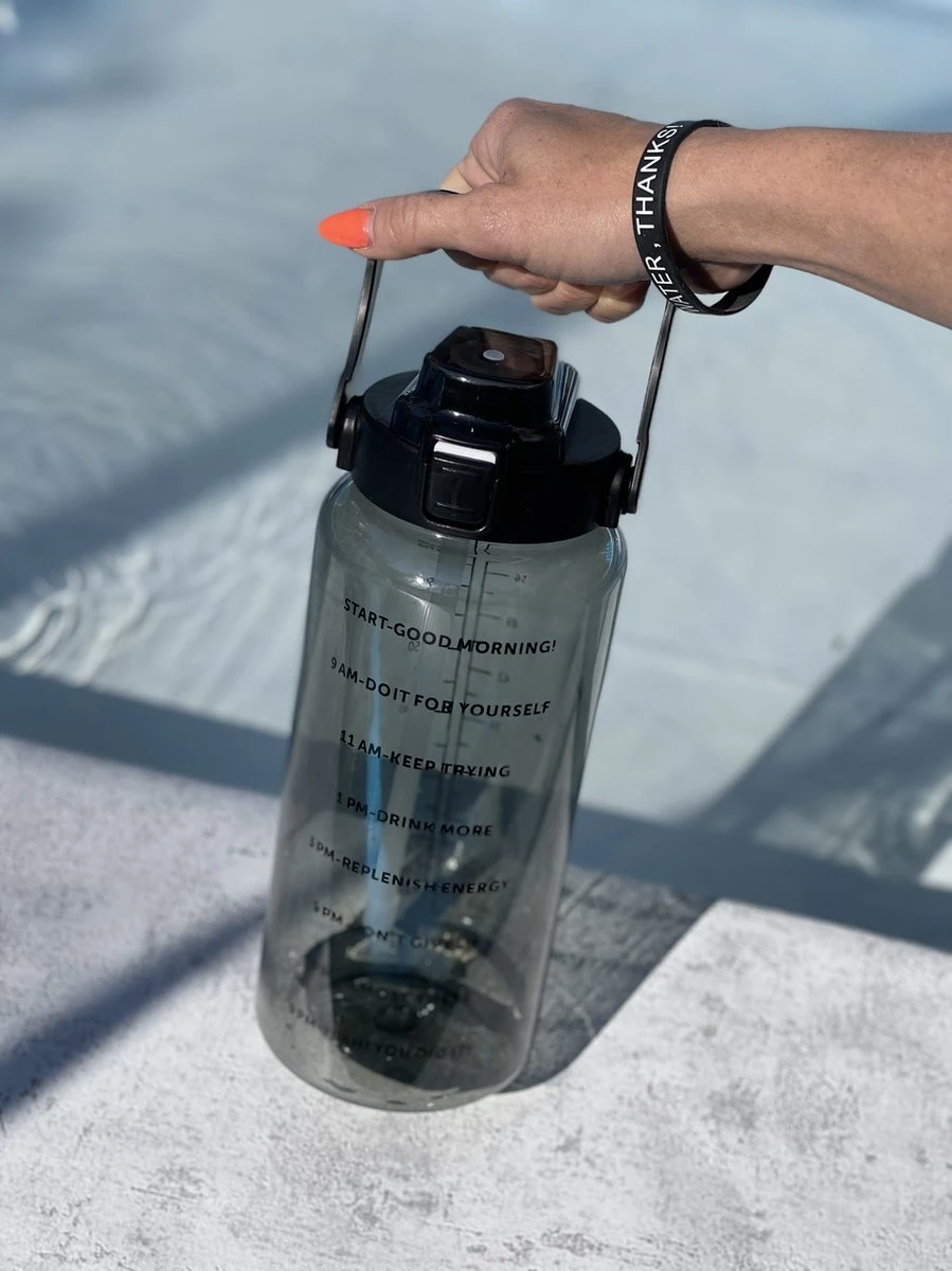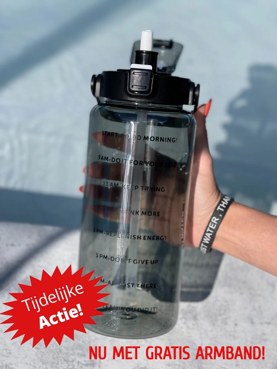 Bestel nu deze motiverende 2 liter fles en krijg er gratis ons ‘reminder’ armbandje t.w.v. 4,99 bij!