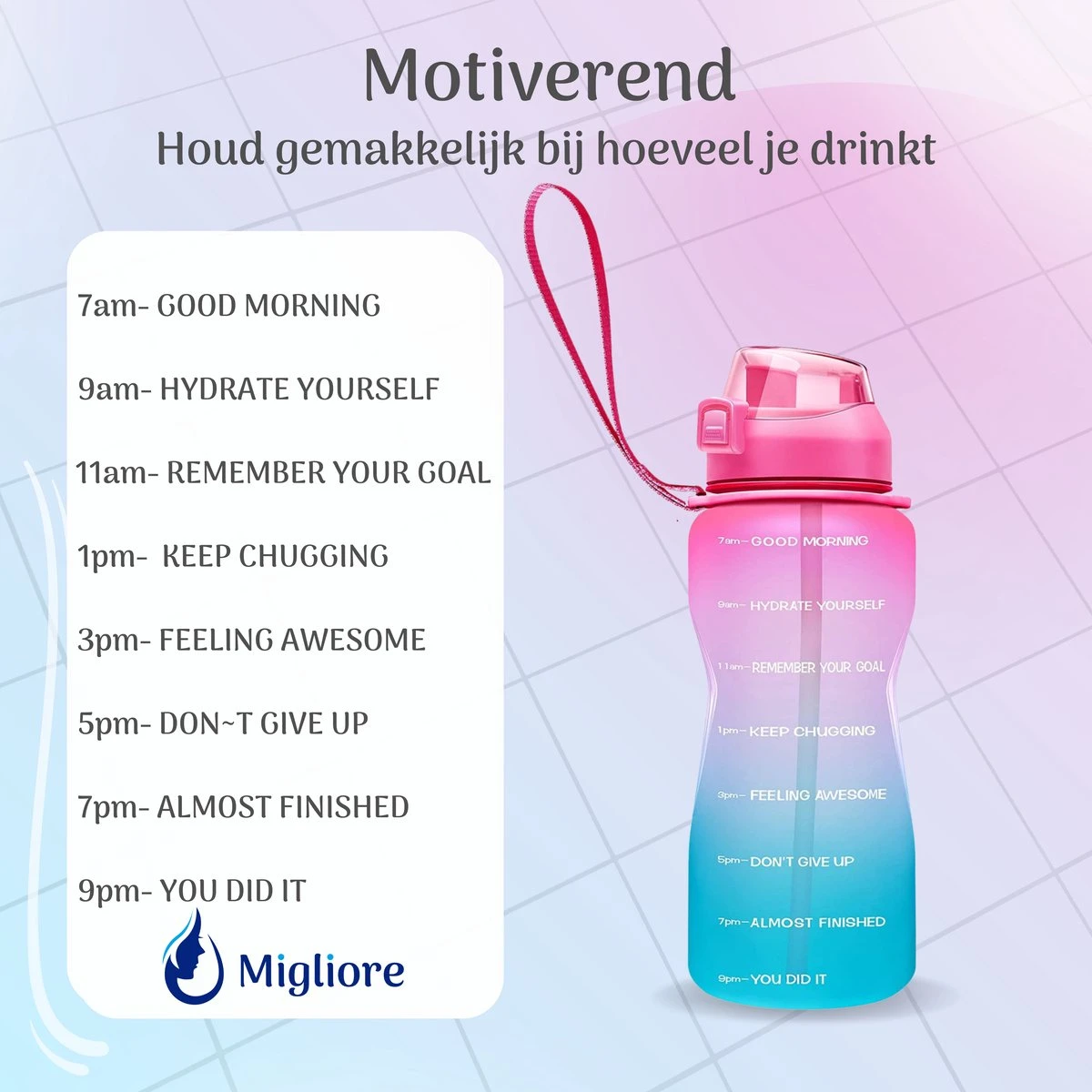 De fles is voorzien van enkele motiverende teksten om jou dat extra zetje in de rug te geven! Vul de fles elke dag, zodat je weet dat jij voldoende water hebt binnengekregen.
